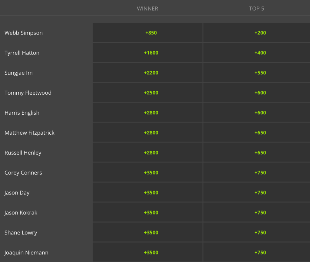 Webb Simpson (+850) enters the week as the outright favorite. He’s coming off a Top 10 performance at the Masters, after shooting a final round 68. Last year at this event, he lost in a playoff to Tyler Duncan, which was his 2nd runner-up finish at the RSM.