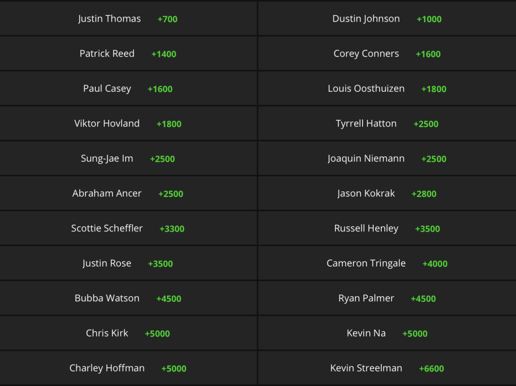 % Chance to Win: 1. Justin Thomas (6.3%), 2. Dustin Johnson (5.2%), Corey Connors (5%)
