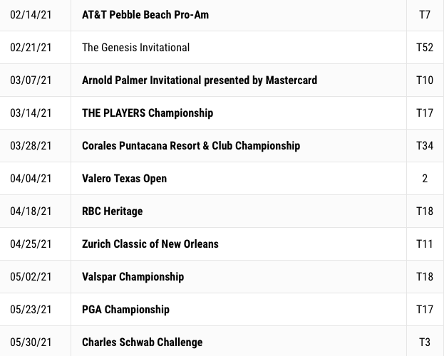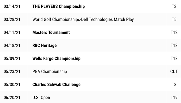 Over his last 7 stoke play event starts, he’s only finished outside the Top 20 once (MC at the PGA Championship).