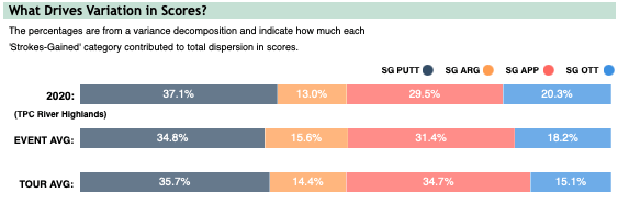 The green complexes around this golf course are difficult, which means the longer putt you have, the less likely it is to go in. Because of that, you see above the biggest impact on scores last year was SG: Putting. If you can roll it well on these greens, you’ll have big advantage over the field.