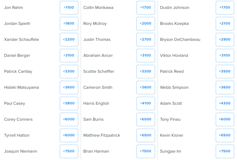 % Chance to Win: 1. Jon Rahm (10.5%), 2. Jordan Spieth (4.5%), 3. Collin Morikawa (4.3%)
